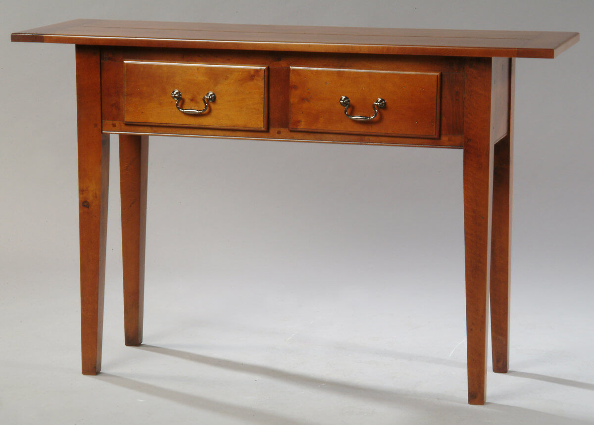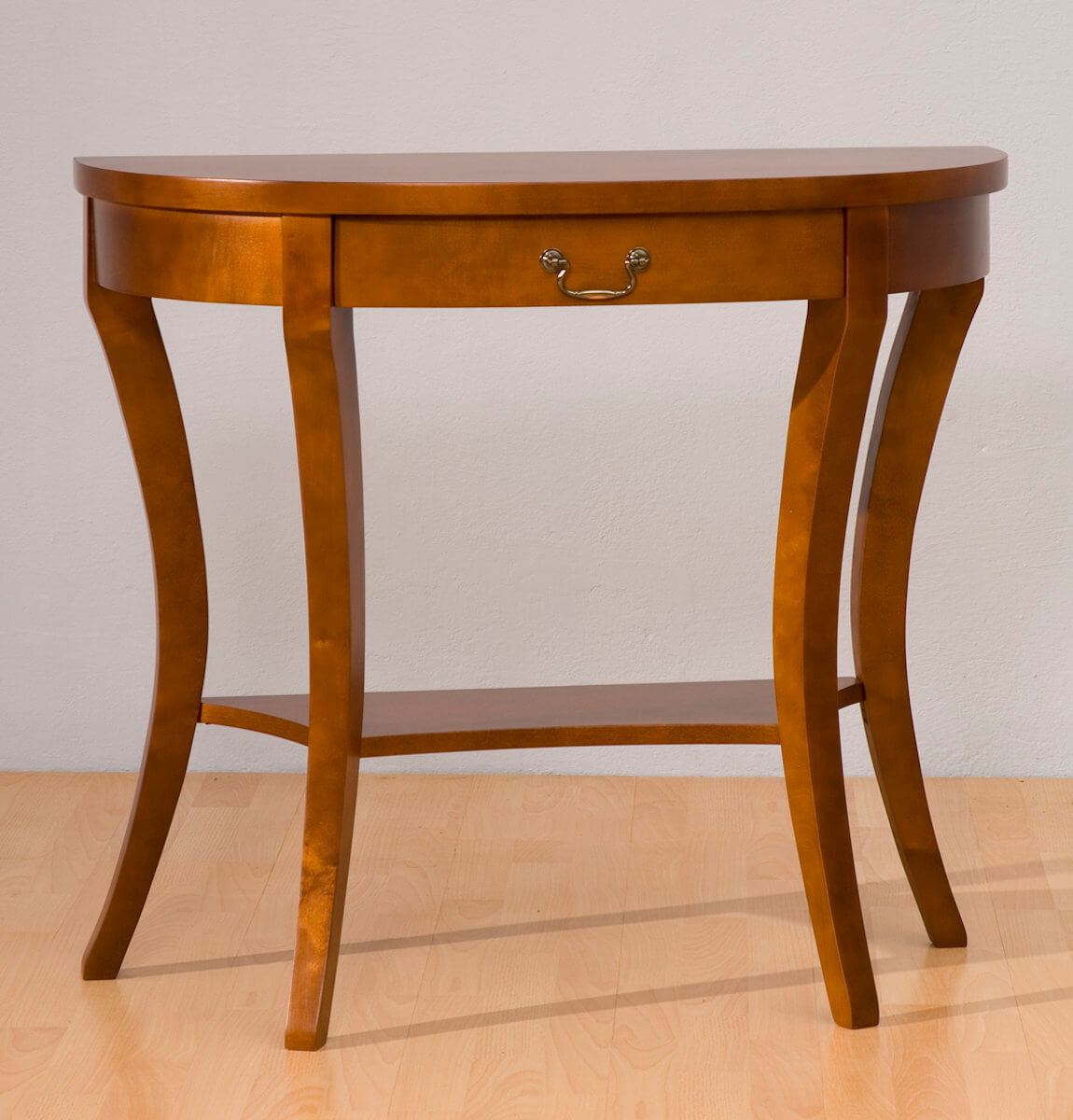 Wersja klasyczna konsolki zachwyca idealnie gładką powierzchnią. Konstrukcja sosnowo-brzozowa, z blatem i oskrzyniami wykonanymi z płyty stolarskiej fornirowanej okleiną liściastą, prezentuje nowoczesny minimalizm. Brak nierówności i efektu patyny nadaje meblowi elegancki, współczesny charakter.
