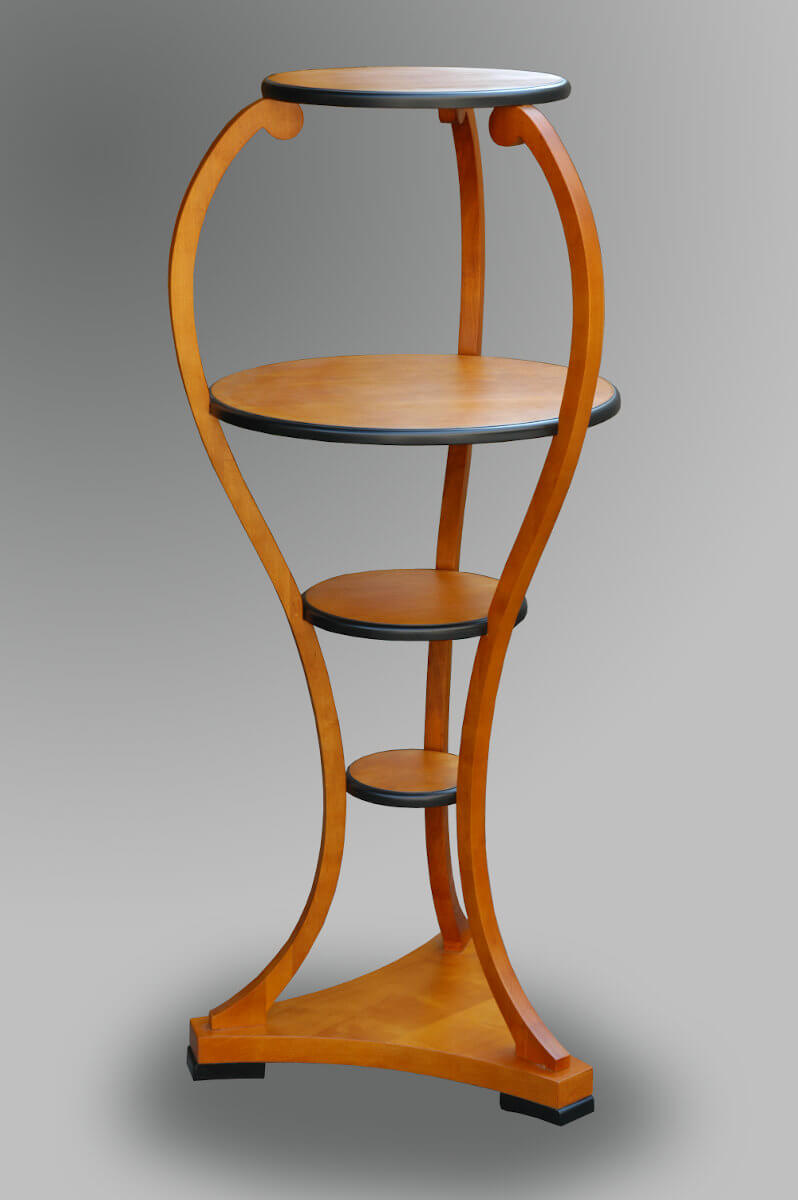 Etażera Biedermeier to prawdziwy klejnot wśród klasycznych mebli. Jej wyrafinowany kształt inspirowany odwróconym wazonem zachwyca harmonią linii typowych dla stylu Biedermeier. Wykonana z drewna brzozowego, z delikatnym lakierem poliuretanowym, doskonale eksponuje kolekcje szkła, porcelany czy rośliny pokojowe. Etażera to mebel, który nie tylko zdobi wnętrze, ale także podkreśla jego wyjątkowy charakter.